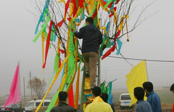 ↑學(xué)生代表用各系的彩旗為金樹披掛上五彩斑斕的旗幟,寓意“十年樹木、百年樹人”。