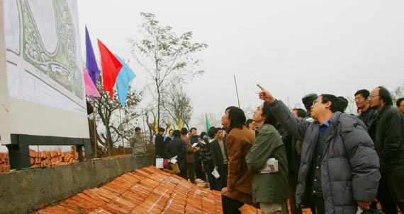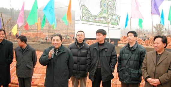 ↑來賓、領(lǐng)導(dǎo)為新校區(qū)奠基石培土。