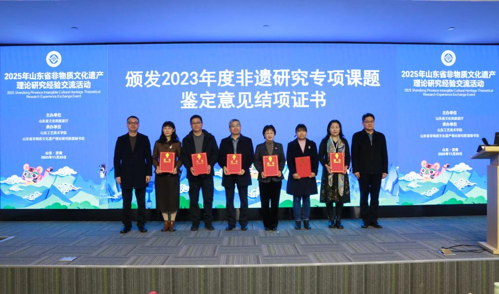 活動(dòng)現(xiàn)場(chǎng)播放了2025年山東省非遺研究基地工作成果宣傳片,頒發(fā)了2023年度非遺研究專(zhuān)項(xiàng)課題鑒定意見(jiàn)結(jié)項(xiàng)證書(shū),并發(fā)布了2026年度非遺研究專(zhuān)項(xiàng)課題,公布了山東省非物質(zhì)文化遺產(chǎn)優(yōu)秀科研成果獲獎(jiǎng)名單,全面展示了全省非遺理論研究與保護(hù)傳承的階段性成效。
