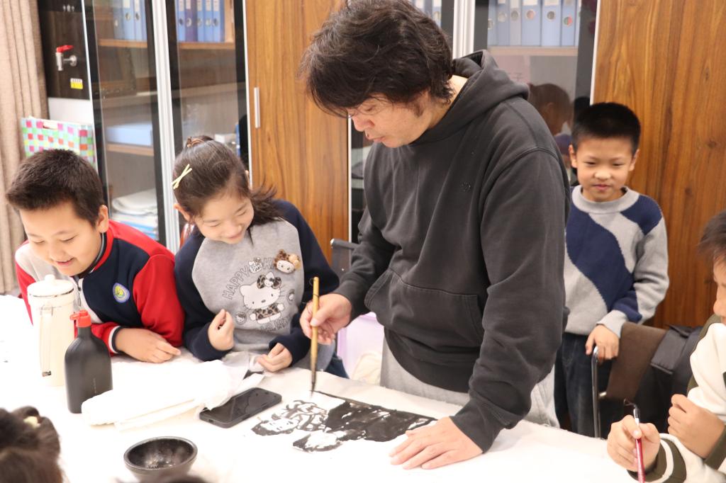 日照社區(qū)墨香氤氳的教室中,造型藝術(shù)學(xué)院陳一云老師打破傳統(tǒng)繪畫教學(xué)邊界,讓水墨藝術(shù)變得親切可感。他從孩子們熟悉的日常趣事切入,將校園花草、伙伴笑臉化作水墨創(chuàng)作的靈感源泉。鋪紙、蘸墨、揮毫,老師寥寥數(shù)筆,山石蒼潤、枝葉疏密便躍然紙上。孩子們紛紛提筆,在宣紙上盡情揮灑創(chuàng)意,將生活感悟化作天真爛漫的筆墨語言。陳老師穿行其間,時而輕聲點(diǎn)撥,時而添筆增色,師生筆下的交融互動,讓美育在潛移默化中完成最生動的傳遞。