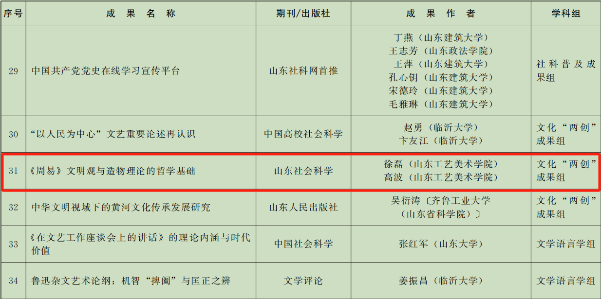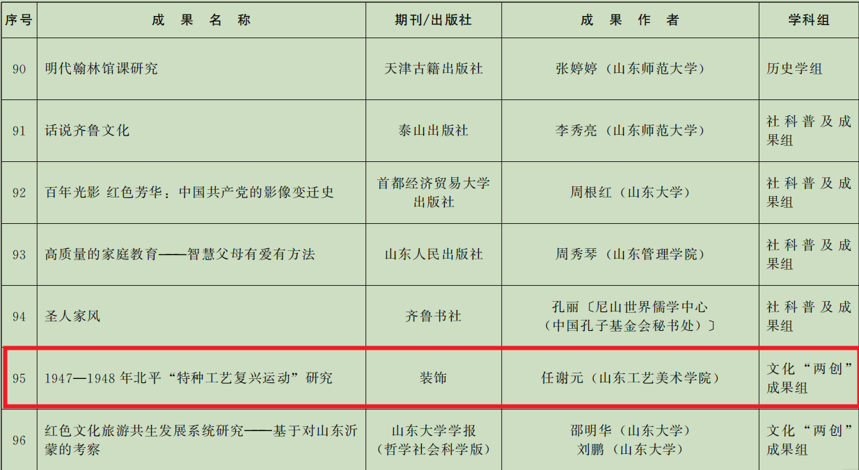 近日,山東省人民政府正式公布第三十七屆山東省社會科學(xué)優(yōu)秀成果獎表彰名單,山東工藝美術(shù)學(xué)院共計(jì)三項(xiàng)成果獲獎,創(chuàng)學(xué)校有史以來最佳成績。其中,院長董占軍教授的成果《藝術(shù)設(shè)計(jì)介入美麗鄉(xiāng)村建設(shè)的原則與路徑》獲交叉學(xué)科組一等獎,徐磊教授、高波副教授的成果《〈周易〉文明觀與造物理論的哲學(xué)基礎(chǔ)》獲文化“兩創(chuàng)”成果組一等獎,任謝元副教授的成果《1947—1948年北平“特種工藝復(fù)興運(yùn)動”研究》獲文化“兩創(chuàng)”成果組三等獎。