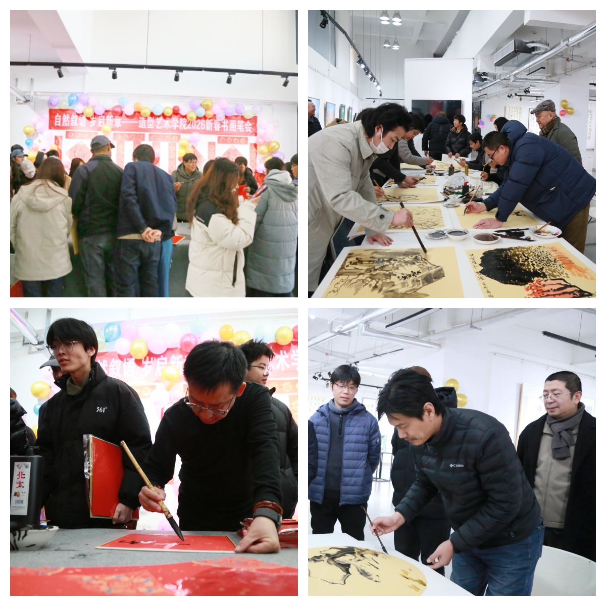 筆會(huì)現(xiàn)場(chǎng)墨香四溢、暖意融融,成為傳承中華優(yōu)秀傳統(tǒng)文化的生動(dòng)課堂。紅箋鋪展間,學(xué)院師生同臺(tái)揮毫,凝神運(yùn)筆中,一個(gè)個(gè)飽滿遒勁、寓意吉祥的“福”字躍然紙上;中國(guó)畫專業(yè)教師現(xiàn)場(chǎng)潑墨寫意,以丹青妙筆繪就山河盛景,盡顯傳統(tǒng)筆墨的獨(dú)特意趣。院長(zhǎng)董占軍、教務(wù)處處長(zhǎng)顧群業(yè),以及造型藝術(shù)學(xué)院優(yōu)秀校友、北京畫院青年畫家韓斌等應(yīng)邀現(xiàn)場(chǎng)創(chuàng)作,一幅幅兼具氣韻格調(diào)與時(shí)代精神的書畫佳作相繼誕生,贏得現(xiàn)場(chǎng)陣陣贊嘆。嘉賓與師生們駐足觀摩、交流探討,爭(zhēng)相領(lǐng)取手寫“福”字,沉浸式感受傳統(tǒng)藝術(shù)與新春氛圍交融共生的獨(dú)特魅力,現(xiàn)場(chǎng)洋溢著師生同樂、薪火相傳的濃厚文化氛圍。