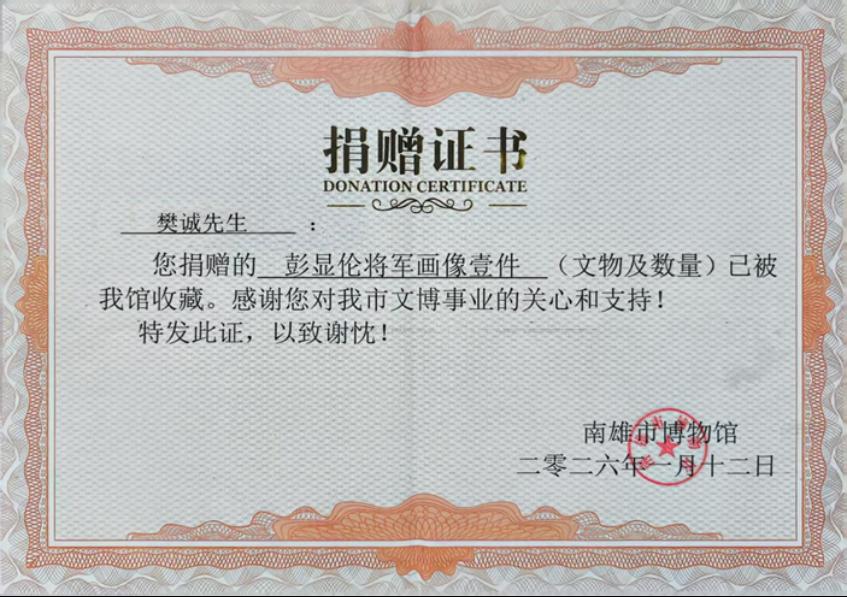 這幅畫作的捐贈(zèng)歷程堪稱一段“紅色奇緣”。2025年,彭匯生女士在紀(jì)念抗戰(zhàn)勝利80周年的紅色書籍美篇中偶然看到該畫,被畫中父親的傳神形象深深觸動(dòng)。歷經(jīng)多方打聽、畫界友人“接力”聯(lián)絡(luò),她最終找到創(chuàng)作者樊誠(chéng)老師。得知將軍后人的心意后,樊誠(chéng)老師當(dāng)即決定無(wú)償贈(zèng)畫,學(xué)校也全力支持這一紅色傳承之舉。在彭匯生女士的提議下,雙方一致同意將畫作捐贈(zèng)給南雄市博物館,讓這份精神財(cái)富惠及更多人。
