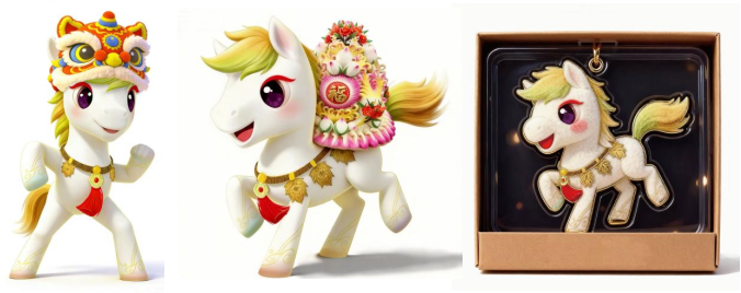 視覺(jué)呈現(xiàn)上,“瑞瑞”將民俗底蘊(yùn)與現(xiàn)代審美巧妙融合,暗藏諸多匠心巧思。吉祥物以純凈白為基底,腳腕與毛發(fā)末端暈染春青、夏赤、秋黃、冬紫的四季流光,將全年時(shí)序之美凝于一身,寓意“承載時(shí)光、篤行致遠(yuǎn)”,彰顯中華民族自強(qiáng)不息、薪火相傳的精神氣質(zhì);蹄部點(diǎn)綴傳統(tǒng)魚(yú)紋,傳遞“錦鯉送瑞”的民俗內(nèi)涵,寄托著人們對(duì)新年富貴安康、順?biāo)鞜o(wú)憂的美好向往;鬃毛創(chuàng)新性融合麥穗與冰晶意象,既承載著豐收的喜悅與希望,也蘊(yùn)含著寒冬里的溫情與期盼;配飾以杏葉、紅纓、轉(zhuǎn)運(yùn)珠串聯(lián)谷紋絲帶,通體金光點(diǎn)綴,既凸顯祥瑞顯貴的氣質(zhì),又彰顯齊魯大地厚重的農(nóng)耕文化底蘊(yùn)。抬蹄邁步、尾羽輕揚(yáng)的動(dòng)態(tài)設(shè)計(jì)靈動(dòng)鮮活,溫潤(rùn)喜悅的神態(tài)、明亮澄澈的眼神,既滿含給予與分享的溫情,又精準(zhǔn)契合春晚闔家團(tuán)圓、其樂(lè)融融的溫馨氛圍,讓傳統(tǒng)民俗以更具親和力的方式走進(jìn)大眾。