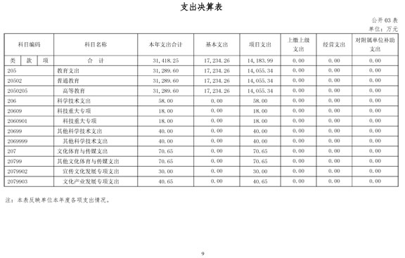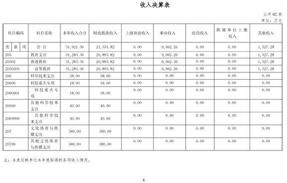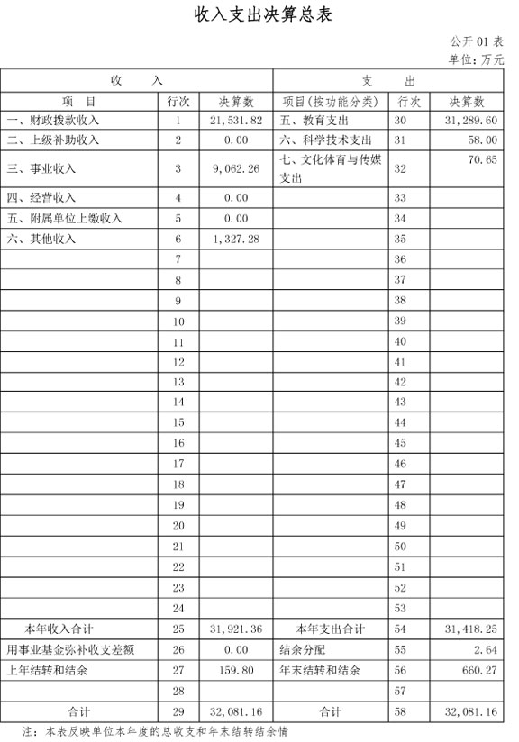 第三部分2015年決算情況和重要事項(xiàng)說明一、2015年決算情況說明(一)收入支出決算總體情況2015年收入總計(jì)32,081.16萬元(其中本年收入31,921.36萬元),包括:財(cái)政撥款收入 21,531.82 萬元,2015年初結(jié)轉(zhuǎn)和結(jié)余159.80萬元。2015年支出總計(jì) 32,081.16 萬元(其中本年支出 31,418.25 萬元),包括:教育支出31,289.60萬元,科學(xué)技術(shù)支出58.00萬元,文化體育與傳媒支出70.65萬元,結(jié)余分配2.64萬元,年末結(jié)轉(zhuǎn)和結(jié)余660.27萬元。(二)財(cái)政撥款收入支出決算總體情況2015年財(cái)政撥款收入決算總計(jì)21,691.62萬元,收入全部為一般公共預(yù)算財(cái)政撥款,無政府性基金預(yù)算財(cái)政撥款收入,包括一般公共預(yù)算財(cái)政撥款本年收入21,531.82萬元、年初結(jié)轉(zhuǎn)和結(jié)余159.80萬元。 2015年財(cái)政撥款支出決算總計(jì)21,691.62萬元,支出具體情況如下:1、教育支出20,902.70萬元,主要用于人員經(jīng)費(fèi)、公用經(jīng)費(fèi)、設(shè)備購置、大型修繕、化解債務(wù)等方面。2、科學(xué)技術(shù)支出58.00萬元,主要用于科技重大專項(xiàng)和應(yīng)用技術(shù)研發(fā)資金、泰山學(xué)者工程建設(shè)專項(xiàng)經(jīng)費(fèi)。3、文化體育與傳媒支出70.65萬元,主要用于公共文化服務(wù)體系建設(shè)資金-宣傳文化發(fā)展、服務(wù)業(yè)發(fā)展專項(xiàng)資金-文化產(chǎn)業(yè)發(fā)展。4、年末結(jié)轉(zhuǎn)和結(jié)余660.27萬元,主要是2015年中央財(cái)政支持地方高校發(fā)展專項(xiàng)資金、教育獎補(bǔ)資金、服務(wù)業(yè)發(fā)展專項(xiàng)資金-文化產(chǎn)業(yè)發(fā)展。(三)一般公共預(yù)算財(cái)政撥款支出決算情況2015年一般公共預(yù)算財(cái)政撥款支出21,031.35萬元,比年初預(yù)算數(shù)增加9,042.35 萬元,主要原因是教育支出、科學(xué)技術(shù)支出、文化體育與傳媒支出均比年初預(yù)算有所增加。支出具體情況如下:1、教育支出20,902.70萬元,主要用于人員經(jīng)費(fèi)、公用經(jīng)費(fèi)、設(shè)備購置、大型修繕、化解債務(wù)等方面, 比年初預(yù)算數(shù)增加8,913.70 萬元,主要原因是年中追加了項(xiàng)目資金,主要包括區(qū)域戰(zhàn)略發(fā)展:省發(fā)改委兩區(qū)主題展館建設(shè)專項(xiàng)資金、2015年中央財(cái)政支持地方高校發(fā)展專項(xiàng)資金、服務(wù)業(yè)發(fā)展專項(xiàng)資金-文化產(chǎn)業(yè)發(fā)展、教育獎補(bǔ)資金等。2、科學(xué)技術(shù)支出58.00萬元,主要用于科研項(xiàng)目支出, 比年初預(yù)算數(shù)增加58萬元,主要原因是年中追加了兩筆項(xiàng)目資金,主要包括科技重大專項(xiàng)和應(yīng)用技術(shù)研發(fā)資金、泰山學(xué)者工程建設(shè)專項(xiàng)經(jīng)費(fèi)。3、文化體育與傳媒支出70.65萬元,主要用于宣傳文化發(fā)展和文化產(chǎn)業(yè)發(fā)展方面支出, 比年初預(yù)算數(shù)增加70.65萬元,主要原因是年中追加了兩筆項(xiàng)目資金,包括公共文化服務(wù)體系建設(shè)資金-宣傳文化發(fā)展、服務(wù)業(yè)發(fā)展專項(xiàng)資金-文化產(chǎn)業(yè)發(fā)展。(四)一般公共預(yù)算財(cái)政撥款基本支出決算情況2015年一般公共預(yù)算財(cái)政撥款基本支出決算 11,479.51萬元,包括人員經(jīng)費(fèi)和公用經(jīng)費(fèi),支出具體情況如下:人員經(jīng)費(fèi)9,190.50萬元,主要包括:基本工資、津貼補(bǔ)貼、社會保障繳費(fèi)、績效工資、離休費(fèi)、退休費(fèi)、生活補(bǔ)助、獎勵金、住房公積金、購房補(bǔ)貼、其他對個人和家庭的補(bǔ)助支出等。公用經(jīng)費(fèi)2,289.01萬元,主要包括:辦公費(fèi)、水費(fèi)、電費(fèi)、郵電費(fèi)、取暖費(fèi)、差旅費(fèi)、勞務(wù)費(fèi)、其他交通費(fèi)用、其他商品和服務(wù)支出。二、重要事項(xiàng)說明(一)政府采購支出情況說明2015年本部門政府采購金額2,959.98萬元,其中:政府采購貨物金額1,525.07萬元、政府采購工程金額636.48 萬元、政府采購服務(wù)金額 798.43 萬元。授予中小企業(yè)合同金額2,006.22萬元,占政府采購總額的67.78% ,其中:授予小微企業(yè)合同金額 1,136.54萬元,占政府采購總額的38.39%。(二)國有資產(chǎn)占用情況說明。截至2015年12月31日,本部門共有車輛 15 輛,其中,公務(wù)用車 15 輛、一般執(zhí)法執(zhí)勤用車 0 輛、特種專業(yè)技術(shù)用車 0 輛、其他用車0 輛;單位價(jià)值200萬元以上大型設(shè)備 0 臺(套)。