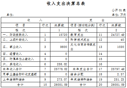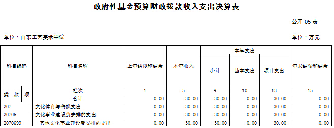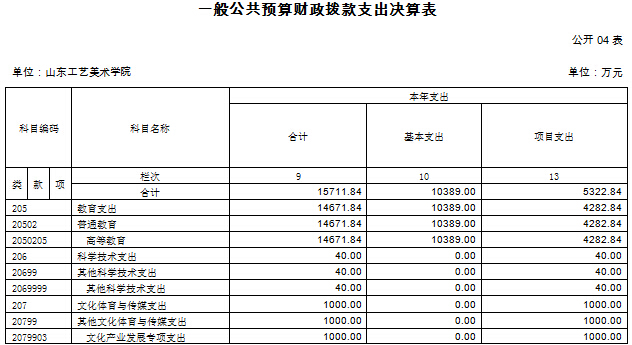 一、收入支出決算總體情況 2014年度收入總計 26051.09萬元,其中:財政撥款收入 15720萬元,事業(yè)收入9800萬元,其他收入258.02萬元,年初結(jié)轉(zhuǎn)和結(jié)余273.07萬元。 2014年度支出總計 26051.09 萬元,其中:教育支出24727.49萬元,科學(xué)技術(shù)支出40萬元,文化體育與傳媒支出1030萬元。 二、一般公共預(yù)算財政撥款支出決算情況 2014年度一般公共預(yù)算財政撥款支出決算為15711.84 萬元,具體情況如下: 1、教育支出14671.84萬元,主要用于高等教育。 2、科學(xué)技術(shù)支出40萬元,主要用于其他科學(xué)技術(shù)支出40萬元。 3. 文化體育與傳媒支出1000萬元,主要用于文化產(chǎn)業(yè)發(fā)展專項(xiàng)支出。 三、政府性基金預(yù)算財政撥款收入支出決算情況 2014年政府性基金預(yù)算財政撥款年初結(jié)轉(zhuǎn)和結(jié)余0萬元,本年收入30萬元,本年支出 30萬元,年末結(jié)轉(zhuǎn)和結(jié)余 0萬元。 2014年政府性基金支出決算為 30萬元,具體情況如下: 文化體育與傳媒安排的支出 30萬元,主要用于其他文化事業(yè)建設(shè)費(fèi)安排的支出。 四、一般公共預(yù)算財政撥款“三公”經(jīng)費(fèi)支出決算情況 無 五、政府采購支出情況 2014年山東工藝美術(shù)學(xué)院政府采購支出總額958.84萬元,其中:政府采購貨物支出583.22萬元、政府采購工程支出375.62萬元、政府采購服務(wù)支出0萬元。