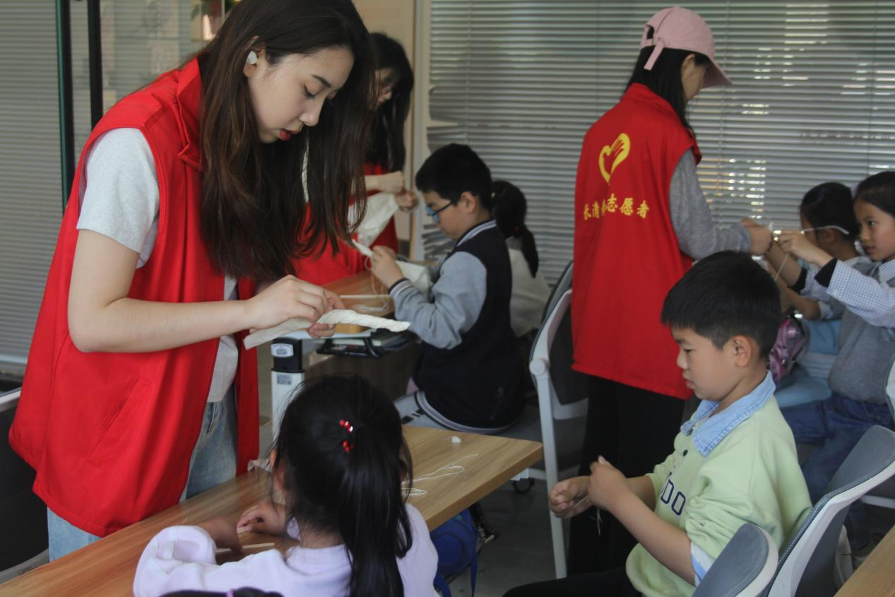 活動伊始,在志愿者詳細介紹扎染的歷史淵源和制作原理后,孩子們對扎染技藝產(chǎn)生了濃厚的興趣。隨后,在志愿者的引導(dǎo)下,孩子們開始了自己的扎染創(chuàng)作之旅。孩子們充分發(fā)揮自己的想象力和創(chuàng)造力,扎出了各式各樣的圖案,每一件作品都充滿了童趣和創(chuàng)意。在等待方巾染色的過程中,孩子們還積極向志愿者請教扎染的技巧和注意事項,表現(xiàn)出了對傳統(tǒng)文化的濃厚興趣和熱愛。志愿者們耐心解答了孩子們的問題并分享經(jīng)驗和心得。作品完成后,看著自己親手制作的扎染作品,孩子們的臉上露出了驚喜和自豪的笑容。他們互相展示自己的作品,交流創(chuàng)作心得,現(xiàn)場氣氛熱烈而溫馨。