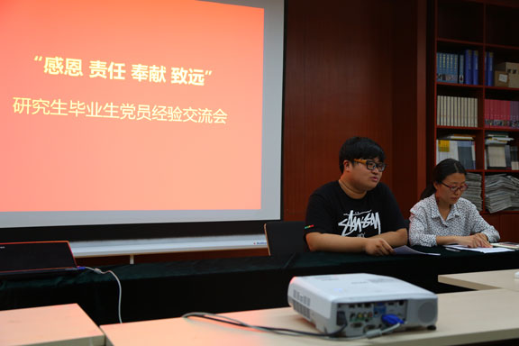 為充分發(fā)揮優(yōu)秀畢業(yè)生黨員的先鋒模范作用,引導(dǎo)學(xué)生黨員與入黨積極分子做好學(xué)業(yè)和職業(yè)規(guī)劃,6月14日下午,研究生黨支部在研究生學(xué)術(shù)活動室開展了以“感恩 責(zé)任 奉獻 致遠”為主題的畢業(yè)生黨員經(jīng)驗交流會,黨支部全體黨員和入黨積極分子參加了此次活動。 交流會上,三位畢業(yè)生黨員結(jié)合自己的學(xué)習(xí)和入黨經(jīng)歷,分別講述了在大學(xué)期間如何發(fā)揮黨員先鋒模范作用。肖灑學(xué)長就作為學(xué)生干部如何更好的開展學(xué)生工作,及處理好學(xué)習(xí)與工作的關(guān)系進行了詳細的介紹,鼓勵大家注意培養(yǎng)各方面的能力,要樂于奉獻,勇于擔(dān)責(zé);郭芹學(xué)姐則與大家分享了她求職中的心路歷程,并介紹了在畢業(yè)論文撰寫方面的經(jīng)驗,告訴大家要提前做好規(guī)劃,多與導(dǎo)師溝通,做研究要踏實、勤懇和創(chuàng)新;秦路芳學(xué)姐以回顧研究生三年生活的方式,講述了自己思想的不斷變化和成長,提醒我們要講黨性、重品行、起模范帶頭作用,傳遞他人以正能量。 本次經(jīng)驗交流會不僅端正了在場同學(xué)作為黨員或積極分子在學(xué)習(xí)生活中的態(tài)度,更使與會學(xué)生明白了把握現(xiàn)在、規(guī)劃人生的重要性。