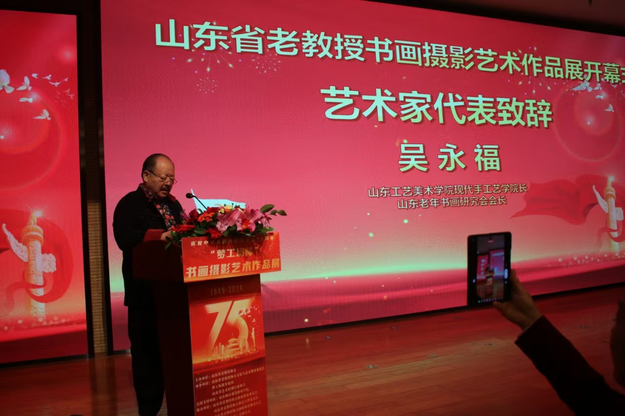 山東工藝美術(shù)學(xué)院老教授協(xié)會(huì)組織老領(lǐng)導(dǎo)、老教授出席開(kāi)幕式并參觀(guān)展覽,開(kāi)幕式由山東省老干部局局長(zhǎng)毛有高主持,山東城建職業(yè)學(xué)院黨委書(shū)記殷濤、夢(mèng)工場(chǎng)教育集團(tuán)董事長(zhǎng)張興致辭,隨后藝術(shù)家代表,羲之書(shū)畫(huà)院院長(zhǎng)李嚴(yán)選同志和山東省老年書(shū)畫(huà)家協(xié)會(huì)會(huì)長(zhǎng)吳永福同志發(fā)言,最后由山東省老教授協(xié)會(huì)會(huì)長(zhǎng)趙彥修致辭并宣布展覽開(kāi)幕。開(kāi)幕式結(jié)束后參會(huì)各界人士在會(huì)場(chǎng)外合影留念。
