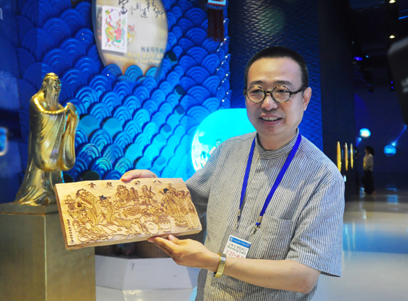 潘魯生:在“非物質(zhì)文化遺產(chǎn)”展示單元里,確立“八仙過海 齊魯先行”的主題,以“八仙過海”傳說為出發(fā)點,通過楊家埠木版年畫、濰坊風(fēng)箏、東昌刻葫蘆、青島貝雕、煙臺剪紙、萊州面花、長島木帆船、曲阜楷木雕刻、菏澤面塑等非物質(zhì)文化遺產(chǎn)形式進(jìn)行演繹,展示古往今來人們對海洋的認(rèn)知探索和息息共融的關(guān)系,融會民風(fēng)民俗民藝與發(fā)展理念,展現(xiàn)山東在文化發(fā)展、海洋開發(fā)以及率先與韓國開展經(jīng)貿(mào)合作等方面積極先行的精神。
