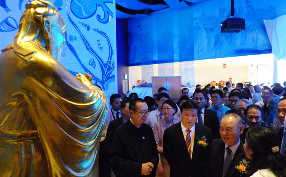 8月3日上午,“2012韓國(guó)麗水世博會(huì)”山東活動(dòng)周在麗水世博園區(qū)中國(guó)館正式開幕。 開幕式上,山東省委副書記、省長(zhǎng)姜大明與2012韓國(guó)麗水世界博覽會(huì)組委會(huì)委員長(zhǎng)姜東錫共同為孔子像揭幕。姜大明省長(zhǎng)代表山東省政府將麗水世博會(huì)中國(guó)館山東活動(dòng)周展示的孔子像贈(zèng)與2012韓國(guó)麗水世博會(huì)組委會(huì)。 姜大明省長(zhǎng)指出,山東是孔子故里、儒家文化的發(fā)源地,孔子像既展現(xiàn)了孔子形象,更包含著源遠(yuǎn)流長(zhǎng)儒家思想,希望藉此加強(qiáng)文化交流,傳播孔子的和諧思想,孔子像在麗水世博會(huì)展示并贈(zèng)與韓國(guó)組委會(huì)具有深遠(yuǎn)意義。 姜東錫表示,非常感謝山東省政府將珍貴的孔子像贈(zèng)與組委會(huì),組委會(huì)將把這尊孔子像安置在2012韓國(guó)麗水世博會(huì)紀(jì)念館最主要的位置進(jìn)行展示,因?yàn)槲覀兎浅W鹁纯鬃雍退乃枷耄M嗟娜藖?lái)了解孔子和他偉大的智慧。 本次世博會(huì)山東活動(dòng)周展示的孔子像,高1.2米,由青銅鑄造,底座1米,為石材構(gòu)筑,整體造像典雅莊重,由山東工藝美術(shù)學(xué)院設(shè)計(jì)創(chuàng)作完成。孔子是中華文化的象征、山東文化的代表,雍容平和的孔子像傳達(dá)了中國(guó)傳統(tǒng)文化“仁”與“和”的精神,體現(xiàn)了仁愛(ài)、和而不同的理念。孔子“四海之內(nèi)皆兄弟也”、“禮之用,和為貴”等論說(shuō),以及儒家“大道之行也天下為公”的理想,體現(xiàn)了和睦共處的和諧思想,同時(shí)也是長(zhǎng)遠(yuǎn)且具有國(guó)際可持續(xù)的發(fā)展理念,其展示與傳播對(duì)應(yīng)本次世博會(huì)為保護(hù)海洋生態(tài)加強(qiáng)國(guó)際社會(huì)合作的倡導(dǎo),具有現(xiàn)實(shí)意義。
