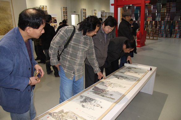 主持山東農(nóng)村文化產(chǎn)業(yè)調(diào)研成果展”。參觀過程中,校友們對調(diào)研和展覽的成果給予了高度評價,并被展廳內(nèi)濰坊楊家埠年畫、風(fēng)箏,臨沂柳編、紅花鄉(xiāng)中國結(jié),曹縣桐楊木藝、鄄城土布、巨野農(nóng)民工筆繪畫等展覽展示項目所吸引,不時合影留念。