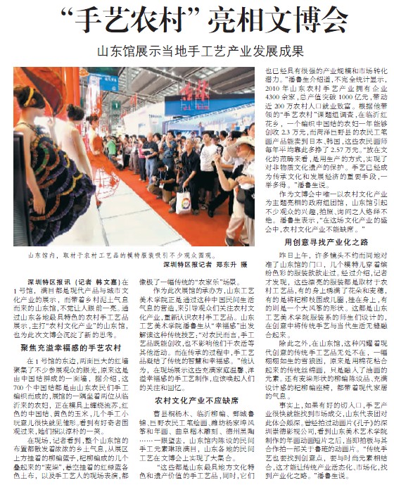 5月15日,第七屆中國(guó)(深圳)國(guó)際文化產(chǎn)業(yè)博覽會(huì)第三天,深圳本地媒體繼續(xù)深入報(bào)道山東館的展覽展示內(nèi)容。《深圳特區(qū)報(bào)》當(dāng)日頭版頭條新聞圖片為記者許業(yè)周拍攝的潘魯生院長(zhǎng)陪同中共中央政治局委員、中央書(shū)記處書(shū)記、中宣部部長(zhǎng)劉云山視察畫(huà)面。《深圳特區(qū)報(bào)》和《深圳商報(bào)》均在A4版發(fā)稿再次大篇幅報(bào)道“手藝農(nóng)村”項(xiàng)目以及山東工藝美術(shù)學(xué)院重視手藝文化傳承的設(shè)計(jì)教育特色。 《深圳特區(qū)報(bào)》A4版以“‘手藝農(nóng)村’亮相文博會(huì)——山東館展示當(dāng)?shù)厥止に嚠a(chǎn)業(yè)發(fā)展成果”為題報(bào)道了山東館的展示特色。文章指出,整個(gè)山東館的布置都散發(fā)著濃濃的鄉(xiāng)土氣息,從展區(qū)上方掛著的柳編籃子,杞柳編成的幾個(gè)疊起來(lái)的“麥垛”,懸空掛著的紅綠藍(lán)各色土布,以及手工藝人的現(xiàn)場(chǎng)表演,都像極了一幅傳統(tǒng)的“農(nóng)家樂(lè)”場(chǎng)景。作為此次展館的承辦方,山東工藝美術(shù)學(xué)院正是通過(guò)這種中國(guó)民間生活氣息的營(yíng)造,來(lái)引導(dǎo)觀眾們關(guān)注農(nóng)村文化產(chǎn)業(yè),重新認(rèn)識(shí)農(nóng)村手工藝品。山東工藝美術(shù)學(xué)院院長(zhǎng)潘魯生從“幸福感”出發(fā)解讀這種傳統(tǒng)技藝:“對(duì)農(nóng)民而言,手工藝品既能創(chuàng)收,也不影響他們干農(nóng)活等其他活動(dòng)。而在傳承的過(guò)程中,手工藝品凝結(jié)了傳統(tǒng)的智慧和幸福感。”他認(rèn)為,在現(xiàn)場(chǎng)展示這些充滿(mǎn)家庭溫馨、洋溢幸福感的手工藝制作,應(yīng)該喚起人們的關(guān)注和回憶。文章轉(zhuǎn)述潘魯生院長(zhǎng)觀點(diǎn)認(rèn)為,事實(shí)上,如果有好的切入口,手藝產(chǎn)業(yè)很快就能找到市場(chǎng)成交。曾經(jīng)拍過(guò)動(dòng)畫(huà)片《孔子》的深圳崇德影視公司,看到山東工藝美術(shù)學(xué)院制作的年畫(huà)動(dòng)畫(huà)短片之后,當(dāng)即拍板與其合作拍一部關(guān)于魯班的動(dòng)畫(huà)片。文章提到,潘魯生認(rèn)為“傳統(tǒng)手藝也要找到創(chuàng)意點(diǎn),要與時(shí)尚元素相結(jié)合,這才能讓傳統(tǒng)產(chǎn)業(yè)活態(tài)化、市場(chǎng)化,找到產(chǎn)業(yè)化之路。” 《深圳商報(bào)》A4版以“沒(méi)有自我表達(dá)就沒(méi)有藝術(shù)”發(fā)表了對(duì)我校潘魯生院長(zhǎng)的專(zhuān)訪(fǎng)文章,并報(bào)道了《手藝中國(guó)》書(shū)系工程啟動(dòng)儀式暨《手藝調(diào)研》、《手藝創(chuàng)意》首發(fā)儀式活動(dòng)。文章認(rèn)為,藝術(shù)家的藝術(shù)創(chuàng)造力是一種綜合的素養(yǎng),首先,要有好的知識(shí)積累,這樣就有了底;其次,一定要了解、關(guān)注當(dāng)代藝術(shù)的進(jìn)程;再次,有獨(dú)特而堅(jiān)定的理念,鮮明的藝術(shù)表現(xiàn)力。一個(gè)人的創(chuàng)新能力是最為關(guān)鍵的,而技法往往是最次要的。談到藝術(shù)教育的發(fā)展,潘魯生院長(zhǎng)認(rèn)為,中國(guó)的高等教育快速發(fā)展,藝術(shù)教育駛?cè)胍粋€(gè)“快車(chē)道”。今年年初,國(guó)務(wù)院學(xué)位委員會(huì)通過(guò)將藝術(shù)學(xué)科獨(dú)立成為最新的“藝術(shù)門(mén)類(lèi)”。“藝術(shù)學(xué)”學(xué)科門(mén)類(lèi)的確立無(wú)疑是一件令人振奮的消息,但靜下心來(lái)想一想不免也有些擔(dān)心,因?yàn)椤八囆g(shù)學(xué)”作為獨(dú)立學(xué)科門(mén)類(lèi)畢竟剛剛啟程。“這意味著將有更多的‘可耕地’等待我們?nèi)ァ_(kāi)墾’。”文章強(qiáng)調(diào),藝術(shù)教育不僅要普及,更要提高。“大師不一定都通過(guò)高校培養(yǎng),但大師一定要有良好的藝術(shù)教育。”世界上有兩種人最具有創(chuàng)造性。“科學(xué)家注重發(fā)明與創(chuàng)造;藝術(shù)家意在創(chuàng)新。縱觀全球,藝術(shù)學(xué)類(lèi)必將成為引領(lǐng)世界潮流的學(xué)科。重視藝術(shù)與科學(xué)、技術(shù)相結(jié)合,尋找學(xué)科新一輪發(fā)展的突破口是目前的關(guān)鍵。”