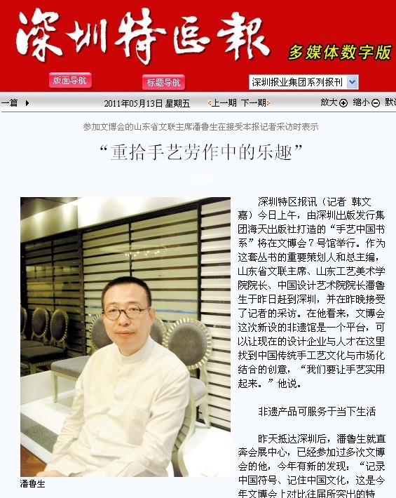 “手藝農(nóng)村 創(chuàng)意齊魯”山東館5月13日在第七屆中國(深圳)國際文化產(chǎn)業(yè)博覽會亮相以來,引起全國各大主流媒體的廣泛關(guān)注。截至今天,共有40余家媒體圍繞山東館進行了報道。 中央電視臺5月13日《新聞聯(lián)播》播報的“第七屆中國國際文化產(chǎn)業(yè)博覽會開幕”報道中,有超過三分之二的視頻畫面為山東館的鏡頭。山東電視臺連續(xù)四天對山東館自布展至運營進行了多視角、全方位的報道。大眾日報對山東館創(chuàng)意展示、創(chuàng)意產(chǎn)品以及山東工藝美術(shù)學(xué)院設(shè)計服務(wù)社會的教學(xué)理念進行了持續(xù)地、深入地報道。深圳特區(qū)報、深圳商報等媒體則結(jié)合對潘魯生院長的采訪,對我校與深圳出版集團合作項目“手藝中國書系”進行了報道。新華網(wǎng)、山東廣播電臺、齊魯晚報、山東商報對山東館亮相深圳文博會的盛況進行了報道。 中國網(wǎng)、千龍網(wǎng)、鳳凰網(wǎng)、中國網(wǎng)絡(luò)電視臺、新民網(wǎng)、中國經(jīng)濟網(wǎng)、中工網(wǎng)、中國日報網(wǎng)、中國青年網(wǎng)、搜狐網(wǎng)、網(wǎng)易等新聞門戶網(wǎng)站對相關(guān)報道進行轉(zhuǎn)載。