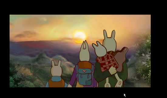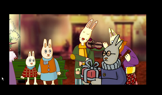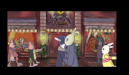王:作品內(nèi)容是這樣的:在歡樂的圣誕夜,商店里擺放著琳瑯滿目的商品,人們都在為節(jié)日忙碌著。兔子一家四口流浪在街頭,琴師用心的演奏著,小兔子則被售貨車上的一塊糖所吸引.而一塊糖對這一家人來說是奢侈的,他們用身上僅有的一枚硬幣換來了那塊糖作為圣誕的禮物.這塊糖被分為四塊,幸福在他們心中傳遞。幸福來自家人愛的分享,來自心中充滿的希望。