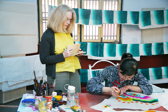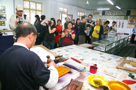 在楊家埠,副所長(zhǎng)趙屹帶領(lǐng)美國(guó)項(xiàng)目組成員考察了“楊家埠民間藝術(shù)大觀園”,并重點(diǎn)走訪了相關(guān)年畫(huà)、風(fēng)箏藝人,考察了楊家埠木版年畫(huà)及風(fēng)箏的制作工藝、傳統(tǒng)藝術(shù)作品與藝術(shù)風(fēng)格等。考察團(tuán)對(duì)于楊家埠木版年畫(huà)、風(fēng)箏這兩種民間傳統(tǒng)手工技藝表現(xiàn)出濃厚的興趣。她們表示:山東是傳統(tǒng)民間手工藝資源極為豐富的地區(qū),我們要將此次考察的內(nèi)容拍攝制作成視頻短片,放到“中國(guó)藤”網(wǎng)站上,更好地宣傳中國(guó)傳統(tǒng)文化與優(yōu)秀的民族民間文化遺產(chǎn)。