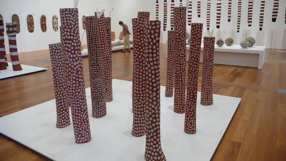 昆士蘭現(xiàn)代藝術(shù)博物館主要收藏展覽收藏現(xiàn)當(dāng)代藝術(shù),特別是亞太地區(qū)的當(dāng)?shù)厮囆g(shù),以及澳大利亞土著藝術(shù)。考察當(dāng)天正在舉辦《第五屆亞太地區(qū)當(dāng)代藝術(shù)展》(The 5th Asia-pacific Triennial of Contemporary Art,每三年舉辦一次)和《北昆士蘭土著藝術(shù)展》(Indigenous Art From North Queensland)體現(xiàn)了該現(xiàn)代藝術(shù)館的主題,現(xiàn)代藝術(shù)代表了東西藝術(shù)交流大背景下,亞太地區(qū)有代表性的藝術(shù)觀念。而土著藝術(shù)的收藏和展覽則深刻體現(xiàn)了澳大利亞對(duì)澳洲本土藝術(shù)保護(hù)的重視,也是文化多元發(fā)展的體現(xiàn)。