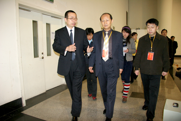 視察結束后,我校領導與宋承祥副廳長、王坦院長在舜耕國際會展中心一樓會議室進行了座談。刁在祥副院長向宋承祥副廳長、王坦院長匯報了我校2007年招生專業(yè)報名考試情況及我校招生工作采取的主要措施。他說道,我校本著“安全第一,考生為本”的招考原則,高度重視安全保衛(wèi)工作,提前與濟南市公安局、文保大隊和保安公司及時溝通,制定了嚴謹周密的安全保衛(wèi)工作預案;為分散考生流量,給考生提供最大方便,我校今年推出了網(wǎng)上報名和分點報考的新舉措,省內增設了青島報考點。此外,在招生考試過程中,學校對每一個環(huán)節(jié)都做了精心部署、周密安排,嚴格控制抽題、考試、閱卷三大主要環(huán)節(jié)。媒體代表現(xiàn)場抽取試題,紀檢部門、各大媒體及考生家長代表現(xiàn)場監(jiān)督以及家長代表巡視考場等措施,更加保證了考試的公正、公平,請考生放心,考生家長放心、社會放心。