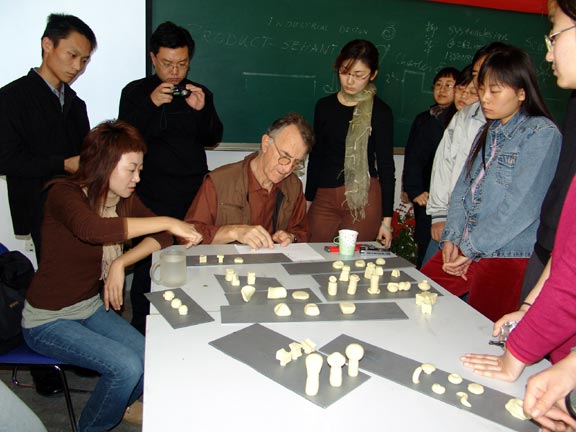 上午,雷曼教授對11月8日與11月9日兩天學(xué)員們Exercise A的設(shè)計(jì)作品進(jìn)行了集體演示性講評。隨后,雷曼教授開始布置Exercise B,在這個練習(xí)中,要求學(xué)員用橡皮泥設(shè)計(jì)制作“同系列按鈕”,分別完成提(Pull)、按(Push)和旋轉(zhuǎn)(Turn)三種功能的形態(tài)設(shè)計(jì)。雷曼教授重點(diǎn)強(qiáng)調(diào),學(xué)員在設(shè)計(jì)過程中一定要注意同一系列中的每一個按鈕功能的語義要清晰,簡潔明了。學(xué)員們在雷曼教授的精心指導(dǎo)下,從各種角度構(gòu)思設(shè)計(jì)了幾組不同的橡皮泥按鈕模型。在一天的教學(xué)過程中,雷曼教授兩次對學(xué)員的作品進(jìn)行了集體講評和多次個別輔導(dǎo)、演示。