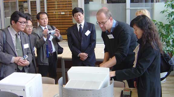 會談結(jié)束后,比勒菲爾德大學系部負責人帶領(lǐng)考察組織成員分別參觀了學生作業(yè)作品展覽、學生考試作品展覽,以及印刷工作室(包括電子印刷、絲網(wǎng)印刷等)、服裝設(shè)計(手繪表現(xiàn))工作室、服裝CAD工作室、服裝面料工作室、油畫工作室、攝影工作室、媒體設(shè)計工作室、圖書館等。參觀了服裝設(shè)計專業(yè)項目教學的基本過程,當場與教師和學生進行了交流,了解項目(主題)教學的理念和方法,學生當場講述了自己通過項目教學進行學習的過程。在參觀媒體設(shè)計工作室時,Andreas Beaugrand博士以一DVD項目設(shè)計的整個過程、內(nèi)容,以及涉及的學科知識為例,向考察組成員詳細介紹了項目教學的基本方法過程。