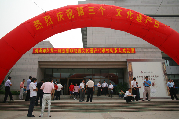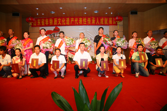 2008年6月14日上午,由山東省委宣傳部、山東省財政廳、山東省文化廳主辦的“傳承與弘揚——山東省非物質(zhì)文化遺產(chǎn)代表性傳承人成就展”在山東省圖書館舉行。山東省人大常委會副主任劉玉功、山東省政協(xié)副主席王志民、山東省委宣傳部副部長徐向紅等領(lǐng)導(dǎo)出席了活動。同時出席活動的還有來自我省高等院校研究所、文化藝術(shù)機構(gòu)、中小學(xué)校以及我省非物質(zhì)文化遺產(chǎn)代表性傳承人共計二百余人。