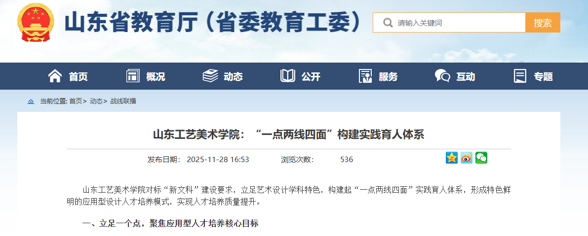 山東省教育廳(省委教育工委)網(wǎng)站《戰(zhàn)線聯(lián)播》欄目 | 山東工藝美術(shù)學院:“一點兩線四面”構(gòu)建實踐育人...